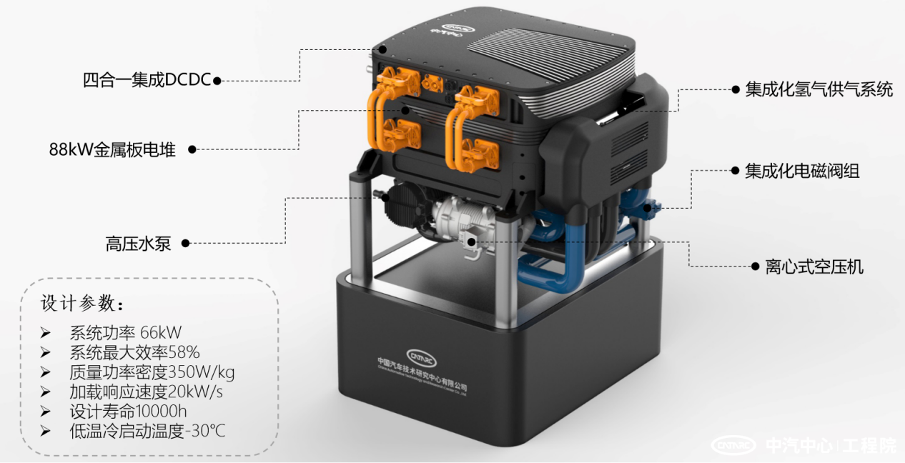 中汽中心工程院依托自身在新能源汽車和電子電控技術(shù)領(lǐng)域的優(yōu)勢(shì),自主設(shè)計(jì)開發(fā)了燃料電池發(fā)動(dòng)機(jī),一級(jí)零部件國(guó)產(chǎn)化率100%,系統(tǒng)最大效率達(dá)到58%,系統(tǒng)質(zhì)量功率密度達(dá)到350W/kg,發(fā)動(dòng)機(jī)展現(xiàn)出優(yōu)異的冷啟動(dòng)表現(xiàn),成功實(shí)現(xiàn)-30℃低溫冷啟動(dòng),相關(guān)技術(shù)指標(biāo)達(dá)到國(guó)內(nèi)領(lǐng)先水平。