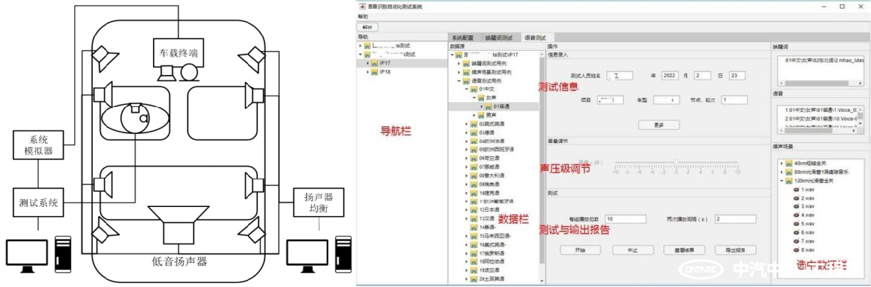 因此,如何在實(shí)驗(yàn)室環(huán)境或靜態(tài)的車輛內(nèi)部,快速模擬實(shí)車復(fù)雜多變的噪聲環(huán)境并進(jìn)行語音識(shí)別性能的測試,顯得尤為必要?中汽中心工程院電聲團(tuán)隊(duì)依據(jù)ESTI 202 396-1標(biāo)準(zhǔn)和ETSI TS 103 224標(biāo)準(zhǔn)開發(fā)的語音識(shí)別測試系統(tǒng),可為語音識(shí)別測試模擬各種噪聲場景,完成多音區(qū)語音交互系統(tǒng)的大規(guī)模識(shí)別性能測試任務(wù),并一鍵導(dǎo)出性能評估報(bào)告。