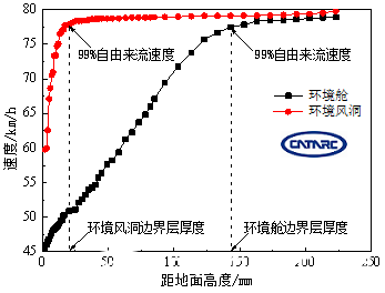 圖2 距風(fēng)洞噴口和環(huán)境艙風(fēng)機(jī)出口1m處邊界層厚度對(duì)比(目標(biāo)風(fēng)速80km/h)