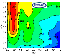 圖3 距環(huán)境風(fēng)洞噴口和環(huán)境艙風(fēng)機(jī)出口1m處溫度分布(目標(biāo)溫度25℃和20℃)