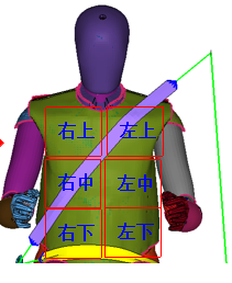 試驗統(tǒng)計新版THOR假人胸部失分較多,對比THOR假人身體比HIII假人更柔軟,碰撞過程中THOR假人前傾更多,會造成更大的胸壓傷害。同時分析THOR假人與HIII假人胸部傳感器差異較大,HIII假人的上中下三根肋骨,而THOR假人左右上下胸部四個部位傳感器(如下圖所示),針對于HIII假人傳統(tǒng)的約束系統(tǒng)單參數(shù)優(yōu)化方案對于THOR假人適用性有限,對于胸部傷害敏感程度更高的THOR假人,需要尋求多方約束系統(tǒng)零部件的最優(yōu)參數(shù)平衡點。另一個方面乘員運動受車身加速度直接影響,對于加速度過高的車型而言,駕駛員胸部傷害很難做到平衡匹配,因此需要對結構指標做出嚴格控制。