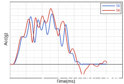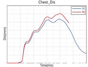 2024版C-NCAP正碰工況碰撞能量的提升引起車體加速度增加,導致HIII主駕假人的胸部得分降低。前圍入侵的增大影響腳部安全空間,小腿得分也普遍降低。下圖為兩個不同的加速度波形下,駕駛員胸部的傷害變化。經對比分析,正面碰撞工況下,若約束系統(tǒng)參數(shù)不變,總體得分降低約2分。