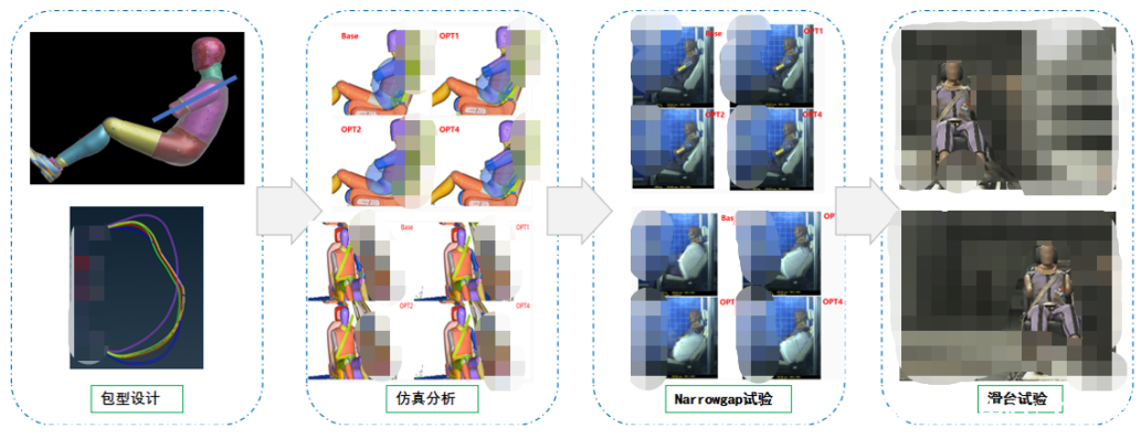 側柱碰撞一般需要設計SAB實現(xiàn)抬手臂效果,以降低假人胸壓。下圖是某車型開發(fā)過程中,對SAB抬手臂的優(yōu)化過程。首先需要結合假人的乘坐姿態(tài),合理設計SAB包型,通過CAE分析確定包型優(yōu)化狀態(tài)。為了保證優(yōu)化效果,需要在整車實驗前,完成narrowgap測試以及滑車驗證,以確保SAB的保護效果。
