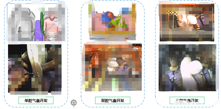 2024版C-NCAP開始在側柱工況中評價遠端保護性能。因此,開發(fā)過程中需要就遠端保護要求進行針對性的開發(fā)。主要通過對遠端氣囊的合理設計來實現(xiàn)假人的保護。遠端氣囊包括單腔氣囊、雙腔氣囊、多腔氣囊,不同的車型情況,需要匹配不同腔類型的氣囊。如下圖所示。