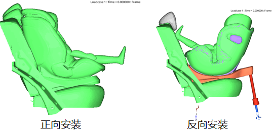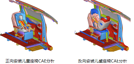 2024版C-NCAP在柱碰工況碰撞側后排,設置了Q3兒童的評價。下圖為某項目柱碰工況Q3兒童分析示意圖,針對正向兒童座椅、反向兒童座椅開展CAE分析。通過分析結果總結Q3兒童容易失分的地方在頭部及頸部,失分原因是兒童座椅側面包裹保護性能不佳,因此在兒童座椅選取中,應該選擇側面包裹性能優(yōu)越的產品。