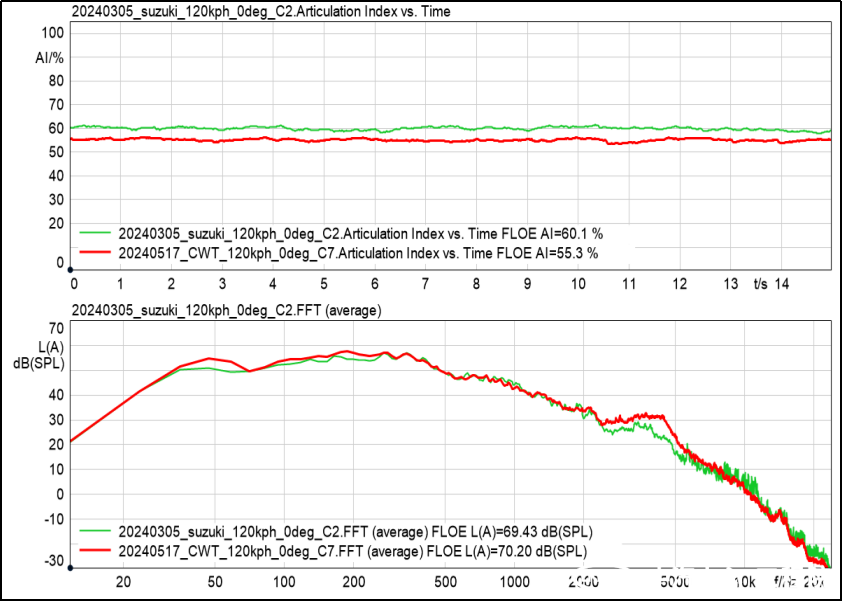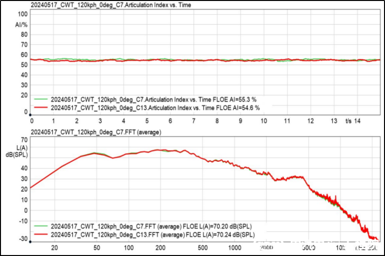 3、環(huán)境風(fēng)洞重卡風(fēng)噪試驗(yàn)數(shù)據(jù)一致性良好,相同工況兩組數(shù)據(jù)差值A(chǔ)計(jì)權(quán)聲壓級0.1dB(A)以內(nèi),語音清晰度指數(shù)差值(AI)0.3%以內(nèi)。能夠精確排查方案貢獻(xiàn)量。
